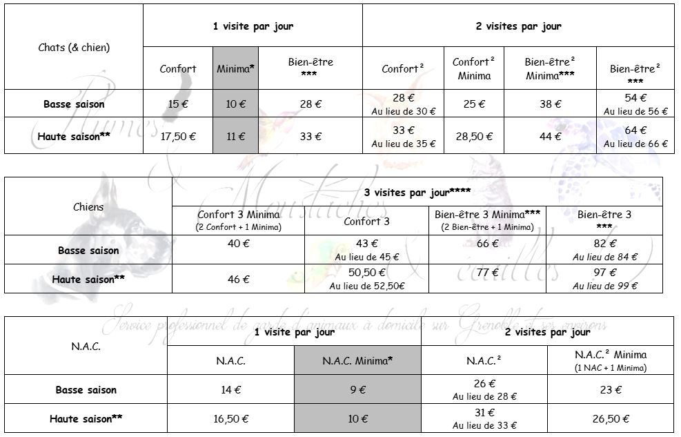 + 5 € par visite (de nouvelles majorations peuvent entrer en vigeur si la demande est trop forte, se reféréer au planning de indisponibilitées à la rubriques "contact")